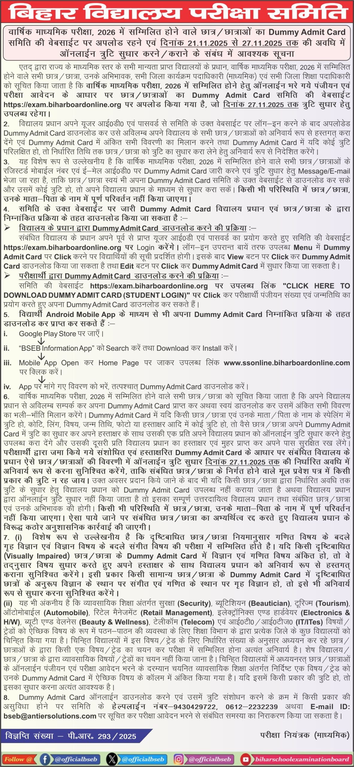 • विद्यालय के प्रधानाचार्य छात्रों की त्रुटि सुधार 27 नवंबर 2025 तक ऑनलाइन अपडेट करेंगे।