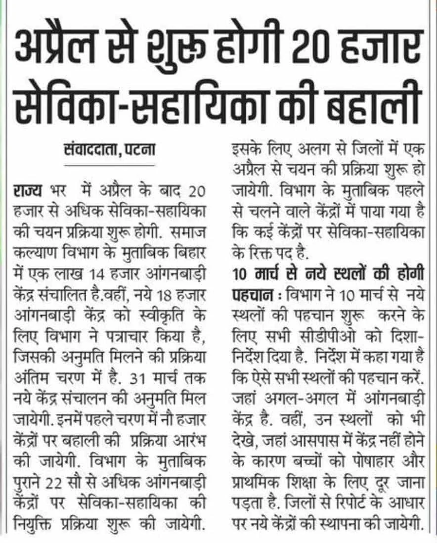 मीडिया रिपोर्ट के अनुसार अप्रैल 2026 से राज्य के विभिन्न जिलों में आंगनवाड़ी सेविका एवं सहायिका के रिक्त पदों पर चयन प्रक्रिया शुरू की जाएगी। पहले चरण में पुराने रिक्त पदों पर बहाली होगी, उसके बाद नए स्वीकृत केंद्रों पर नियुक्ति की जाएगी।