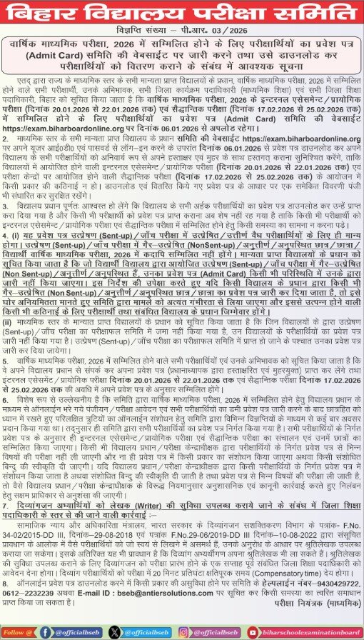 Post NameBihar Board 10th Admit Card 2026