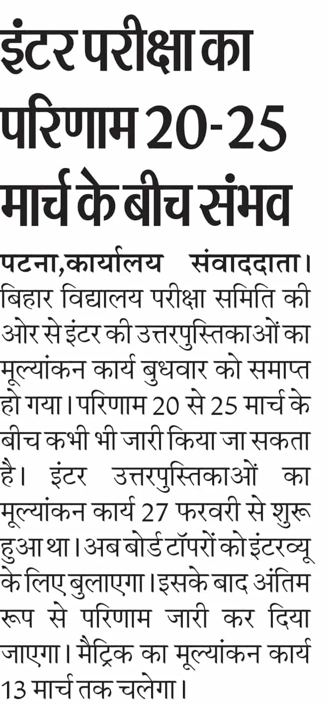 विभिन्न समाचार माध्यमों और शिक्षा से जुड़ी रिपोर्ट्स के अनुसार Bihar Board Inter Result 2026 को 20 मार्च से 25 मार्च 2026 के बीच जारी किया जा सकता है.