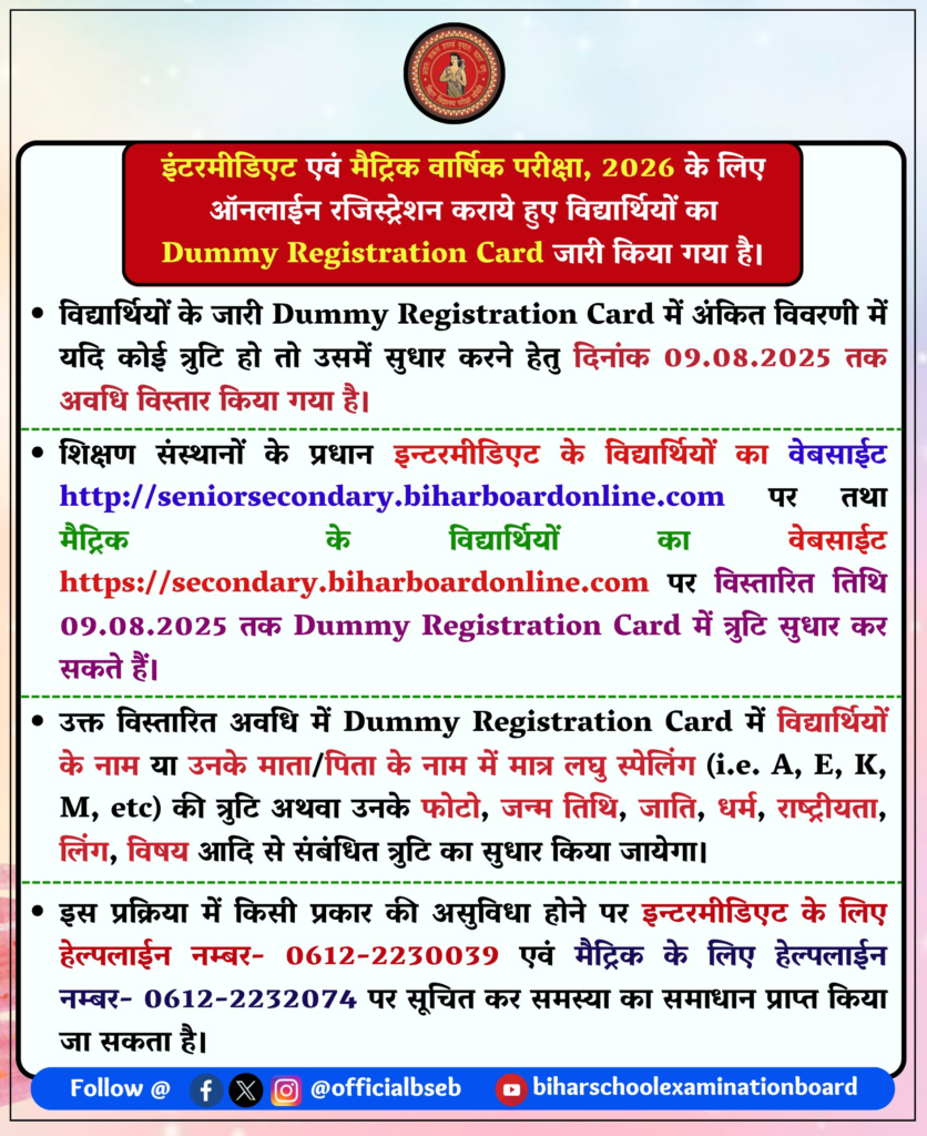 अगर आप बिहार बोर्ड से इंटरमीडिएट परीक्षा 2026 देने जा रहे हैं, तो आपके लिए एक बहुत जरूरी अपडेट सामने आया है। बिहार विद्यालय परीक्षा समिति (BSEB) ने 5 जुलाई 2025 को Bihar Board Inter Dummy Registration Card 2026 जारी कर दिया है। यह डमी रजिस्ट्रेशन कार्ड आपके पंजीकरण में हुई किसी भी गलती को सुधारने का एक सुनहरा अवसर है।