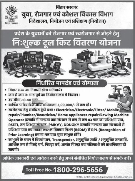 Bihar Free Tool Kit Yojana 2026: हेल्पलाइन नंबर