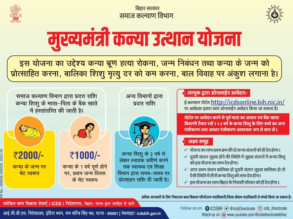 यह मुख्यमंत्री कन्या उत्थान योजना है जिसके तहत बिहार सरकार 0 से 2 वर्ष की आयु की बेटियों को ₹3000 की राशि देती है।