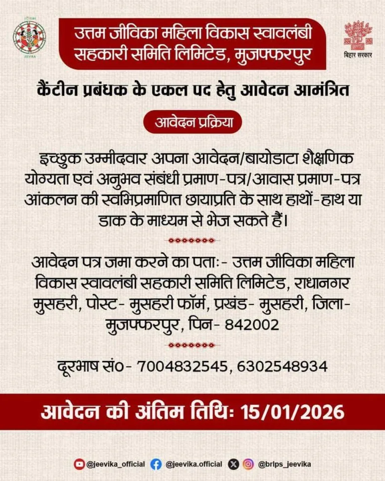 Bihar Jeevika Canteen Manager Vacancy 2026- उत्तम जीविका महिला विकास स्वावलंबी सहकारी समिति लिमिटेड, मुजफ्फरपुर की ओर से Bihar Jeevika Canteen Manager Vacancy 2026 के अंतर्गत कैंटीन मैनेजर के पदों पर भर्ती के लिए आधिकारिक सूचना जारी की गई है। यह भर्ती उन उम्मीदवारों के लिए एक बेहतरीन अवसर है जो होटल मैनेजमेंट या कैटरिंग से संबंधित योग्यता रखते हैं और बिहार में सरकारी/अर्ध-सरकारी क्षेत्र में नौकरी करना चाहते हैं।
