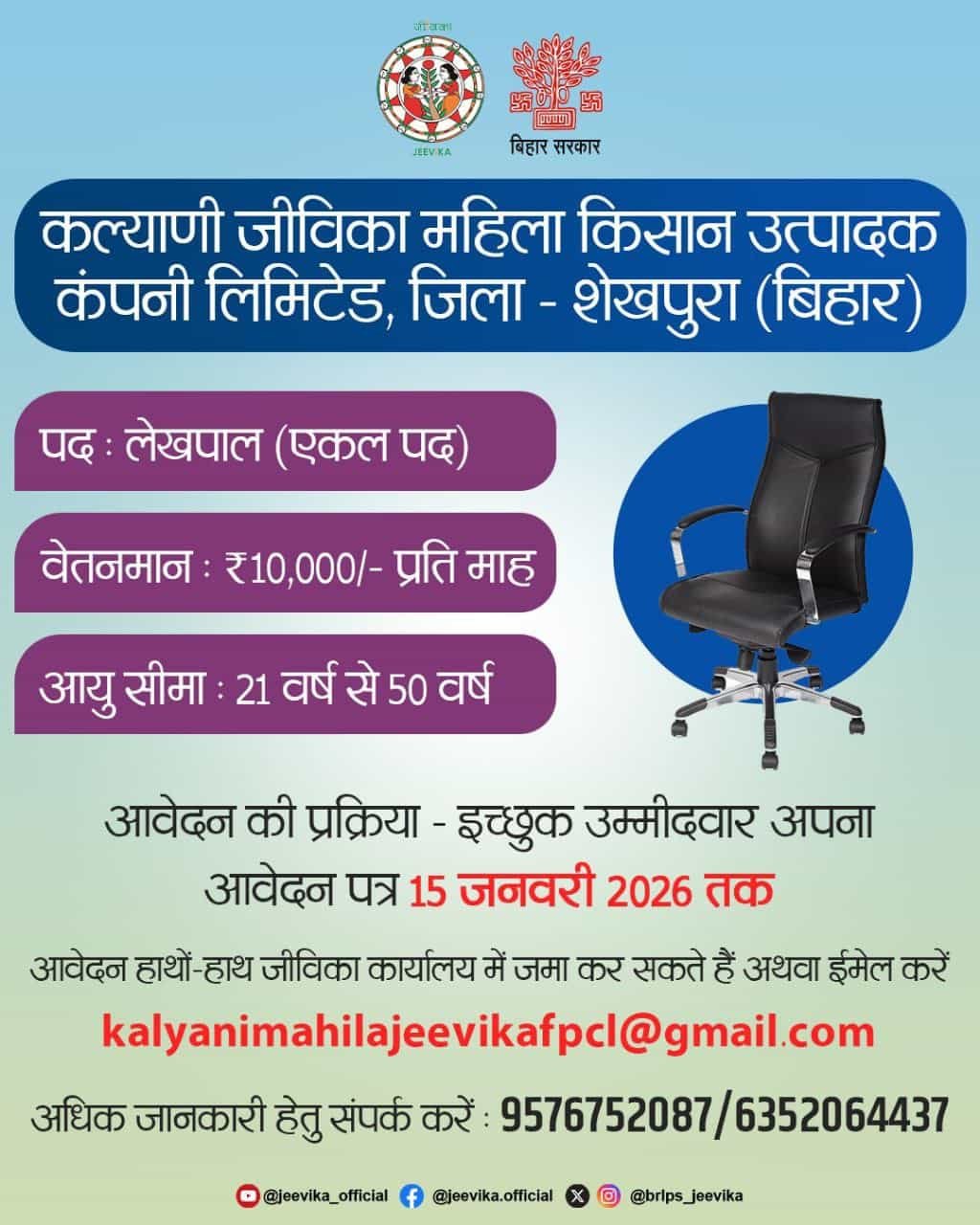अगर आप बिहार में सरकारी/अर्ध-सरकारी नौकरी की तलाश कर रहे हैं और लेखा से जुड़े कार्यों में रुचि रखते हैं, तो Bihar Jeevika Lekhpal Vacancy 2026 आपके लिए एक बेहतरीन अवसर है। बिहार जीविका (BRLPS) के अंतर्गत कल्याण जीविका महिला किसान उत्पादक कंपनी लिमिटेड, जिला – शेखपुरा (बिहार) द्वारा लेखपाल (Lekhpal) के पद पर सीधी भर्ती के लिए आवेदन आमंत्रित किए गए हैं। इस भर्ती की खास बात यह है कि आवेदन प्रक्रिया सरल है और आवेदन ऑफलाइन/ईमेल के माध्यम से किया जा सकता है।
