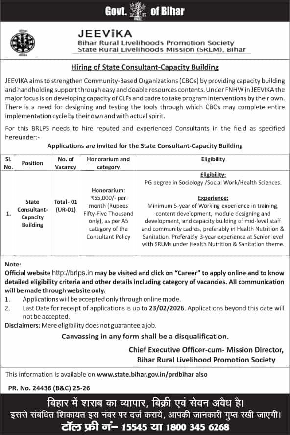 Bihar Jeevika State Consultant Vacancy 2026 उन उम्मीदवारों के लिए एक बेहतरीन अवसर है, जो Social Work, Sociology या Health Sector में उच्च शिक्षा प्राप्त कर चुके हैं और संबंधित क्षेत्र में अच्छा अनुभव रखते हैं। इस भर्ती के माध्यम से Bihar Rural Livelihoods Promotion Society (BRLPS) द्वारा State Consultant – Capacity Building के पद पर योग्य उम्मीदवार का चयन किया जाएगा
