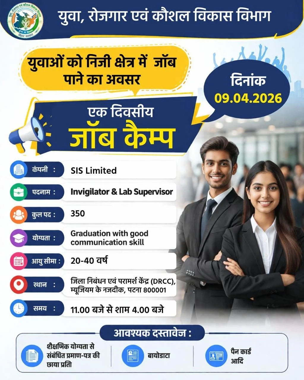 Bihar Job Camp 2026: अगर आप नौकरी की तलाश में हैं और बिना लिखित परीक्षा सीधे इंटरव्यू के माध्यम से जॉब पाना चाहते हैं, तो Bihar Job Camp 2026 आपके लिए एक शानदार अवसर है। बिहार सरकार के युवा, रोजगार एवं कौशल विकास विभाग द्वारा पटना में एक दिवसीय जॉब कैंप का आयोजन किया जा रहा है, जिसमें निजी कंपनी SIS Limited द्वारा Invigilator और Lab Supervisor के पदों पर भर्ती की जाएगी।