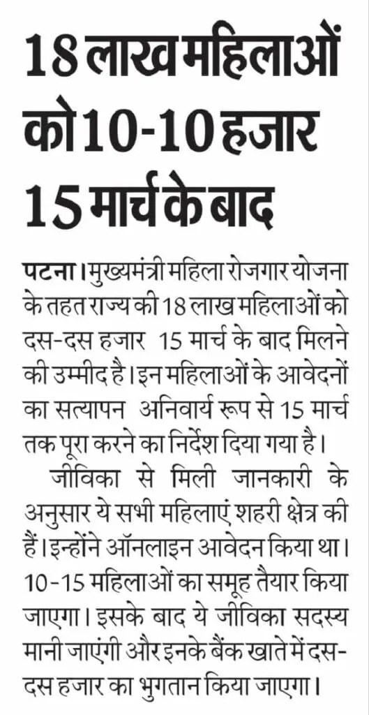 मुख्यमंत्री महिला रोजगार योजना बिहार की महिलाओं के लिए एक बहुत ही महत्वपूर्ण योजना है। इस योजना के तहत राज्य की 18 लाख महिलाओं को ₹10,000 की आर्थिक सहायता दी जाएगी। जिन महिलाओं ने आवेदन किया है और अभी तक पैसा नहीं मिला है, उन्हें 15 मार्च 2026 के बाद पैसा मिलना शुरू हो जाएगा।