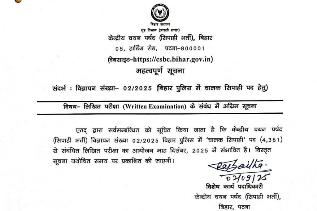 केंद्रीय चयन परिषद (सिपाही भर्ती), बिहार ने चालक सिपाही (Driver Constable) पदों पर होने वाली भर्ती परीक्षा से जुड़ा महत्वपूर्ण नोटिस जारी किया है। विज्ञापन संख्या 02/2025 के तहत कुल 4,361 पदों पर भर्ती प्रक्रिया चल रही है। आधिकारिक सूचना के अनुसार, इन पदों के लिए लिखित परीक्षा का आयोजन दिसंबर 2025 में किया जाएगा।