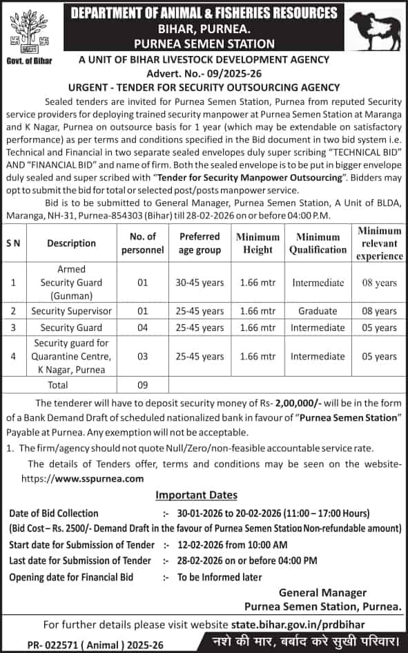 Bihar Security Guard Vacancy 2026 को लेकर बिहार के युवाओं के लिए एक अच्छी खबर सामने आई है। Department of Animal & Fisheries Resources, Bihar की ओर से Security Guard, Armed Guard (Gunman) और Security Supervisor के पदों पर भर्ती को लेकर आधिकारिक टेंडर नोटिस जारी कर दिया गया है। यह भर्ती आउटसोर्सिंग कंपनी के माध्यम से की जाएगी।