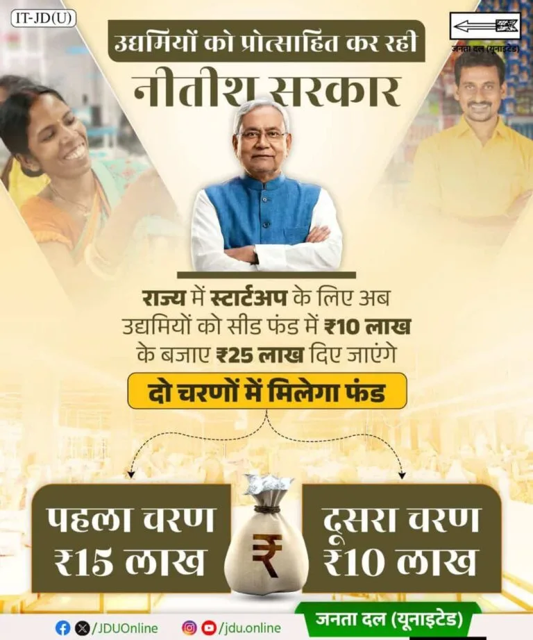 पहले Bihar Startup Yojana के तहत केवल ₹10 लाख तक की सहायता दी जाती थी, लेकिन अब सरकार ने इसे ढाई गुना से भी ज्यादा बढ़ाकर ₹25 लाख कर दिया है।