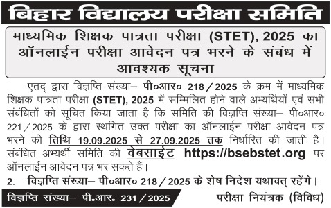 Bihar STET 2025:- बिहार विद्यालय परीक्षा समिति (BSEB) ने सितंबर 2025 को सेकेंडरी टीचर एलिजिबिलिटी टेस्ट (STET) 2025 का आधिकारिक नोटिफिकेशन जारी कर दिया है। इस परीक्षा के लिए ऑनलाइन आवेदन प्रक्रिया 11 सितंबर से शुरू होकर 19 सितंबर 2025 शुरू होने वाली थी जिसे अभी किसी करना स्तगित कर दी गई है।