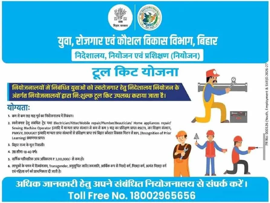 Bihar Tool Kit Yojana 2026 : बिहार सरकार दे रही है बिलकुल मुफ्त टूल किट – ऐसे करें आवेदन, मिलेगा लाभ