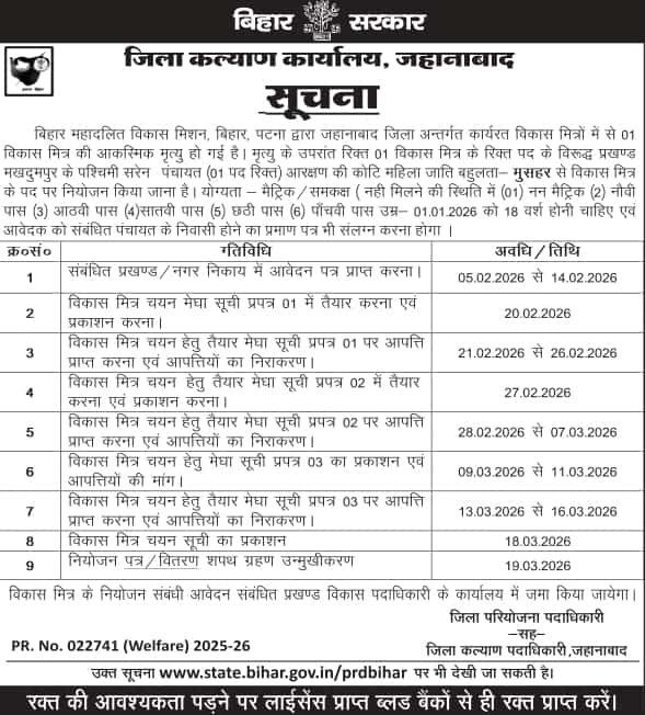 Bihar Vikas Mitra Vacancy 2026– को लेकर बड़ी खबर सामने आई है। बिहार सरकार द्वारा विकास मित्र के पदों पर भर्ती का आधिकारिक नोटिस जारी कर दिया गया है। यह भर्ती जहानाबाद जिला के लिए निकाली गई है और खास बात यह है कि इसमें कोई लिखित परीक्षा नहीं होगी। योग्य उम्मीदवारों का चयन सीधे मेरिट लिस्ट के आधार पर किया जाएगा।