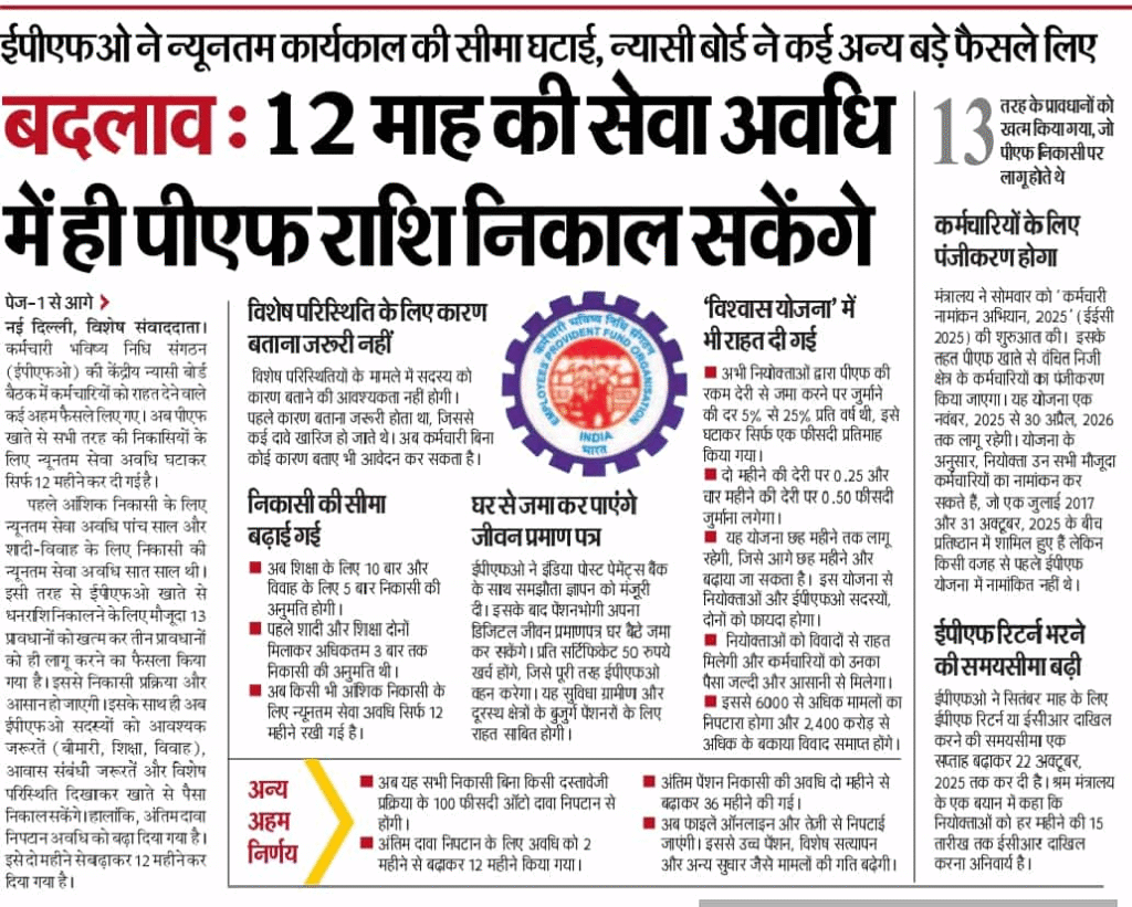 अब PF निकासी के लिए न्यूनतम सेवा अवधि घटाकर 12 महीने कर दी गई है।
