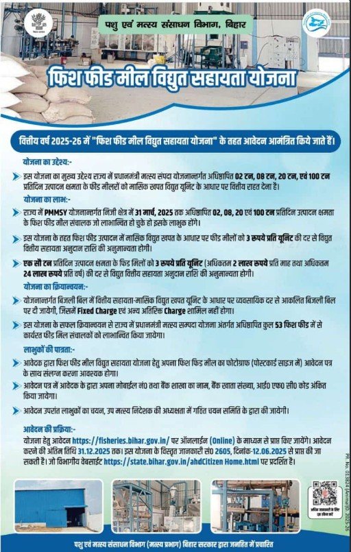 Fish Feed Mill Vidyut Sahayata Yojana Bihar 2025-26 बिहार सरकार की एक महत्वपूर्ण योजना है, जिसके तहत फिश फीड मिल संचालकों को बिजली बिल पर सीधी आर्थिक मदद दी जा रही है। इसका सबसे बड़ा फायदा यह होगा कि उत्पादन लागत घटेगी और मछली पालन से जुड़े उद्यमियों को प्रोत्साहन मिलेगा।