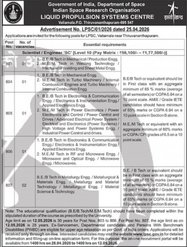 ISRO LPSC Scientist/Engineer Recruitment 2026: अगर आप भी देश की प्रतिष्ठित अंतरिक्ष एजेंसी Indian Space Research Organisation (ISRO) में Scientist/Engineer बनने का सपना देख रहे हैं, तो आपके लिए शानदार मौका आ चुका है। ISRO के अंतर्गत आने वाले Liquid Propulsion Systems Centre (LPSC) ने Scientist/Engineer ‘SC’ के पदों पर भर्ती के लिए जारी कर दिया है।