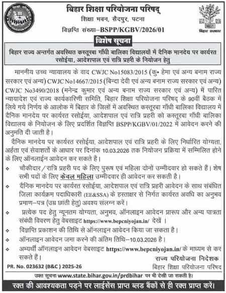 Kasturba Gandhi Vidyalaya Vacancy 2026– बिहार शिक्षा परियोजना परिषद (BEPC) के अंतर्गत बिहार राज्य के सभी जिलों में स्थित कस्तूरबा गांधी बालिका विद्यालयों (KGBV) में रसोइया, आदेशपाल एवं रात्रि प्रहरी के पदों पर नई भर्ती निकाली गई है। इस भर्ती के लिए ऑनलाइन आवेदन प्रक्रिया शुरू कर दी गई है। इच्छुक एवं योग्य उम्मीदवार अंतिम तिथि से पहले आवेदन कर सकते हैं।