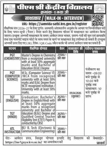 Kendriya Vidyalaya Recruitment 2026 : इन पदों पर भर्ती वाक-इन-इंटरव्यू के माध्यम से लिए जायेगे | आपको बता दे की इसके लिए आवेदन करने के लिए आपको सबसे पहले ऑनलाइन के माध्यम से अपना आवेदन करना होगा | जिसके बाद इच्छुक अभ्यर्थी को साक्षात्कार के साथ आवेदन प्रपत्र भरकर, प्रमाण-पत्रों की मूल एवं छायाप्रति तथा एक पासपोर्ट साइज़ फोटो के साथ स्वयं के खर्च पर साक्षात्कार हेतु उपस्थित हो सकते है |