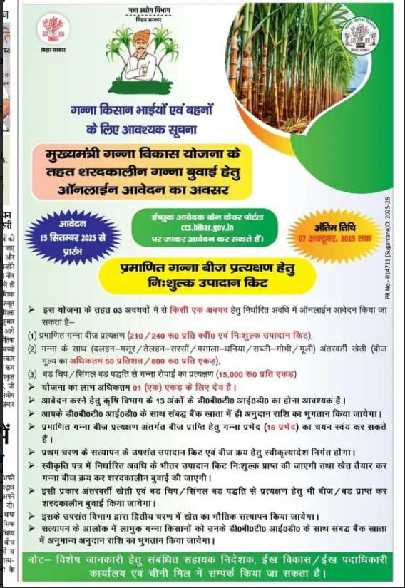बिहार सरकार ने इस योजना के तहत गन्ना किसानों को प्रति एकड़ ₹15,000 की सब्सिडी देने का ऐलान किया है। अगर आप गन्ना किसान हैं और इस योजना का लाभ उठाना चाहते हैं तो आपको इसके लिए ऑनलाइन आवेदन करना होगा, इस आर्टिकल में हम आपको Mukhyamantri Ganna Vikas Yojana 2025 से जुड़ी पूरी जानकारी देंगे – जैसे आवेदन प्रक्रिया, पात्रता, दस्तावेज़, लाभ और महत्वपूर्ण तिथियां।