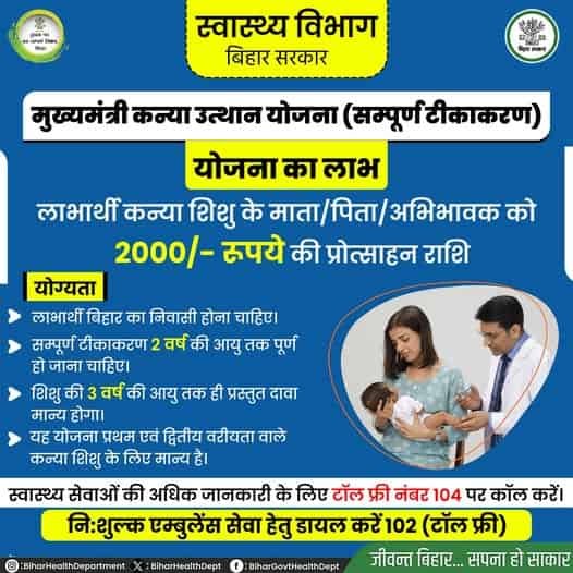 मुख्यमंत्री कन्या उत्थान योजना बिहार सरकार की एक बहुत ही लाभकारी योजना है। इस योजना के तहत बालिका के सम्पूर्ण टीकाकरण पर ₹2000 दिए जाते हैं, जिससे गरीब परिवारों को आर्थिक मदद मिलती है और बालिकाओं के स्वास्थ्य में सुधार होता है।