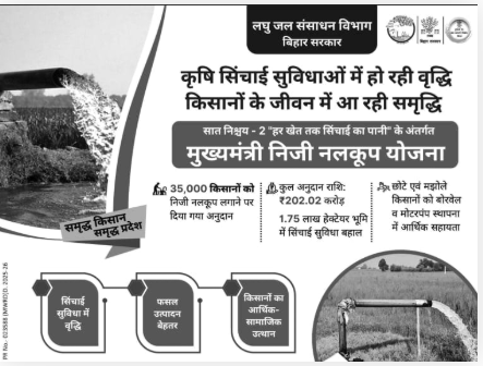 बिहार सरकार के लघु जल संसाधन विभाग के तरफ से मुख्यमंत्री निजी नलकूप योजना चलाई जाती है | आपको बता दे की इस योजना के तहत 35,000 किसानो को निजी नलकूप लगाने पर अनुदान दिया गया है | इसके तहत कुल अनुदान राशी 202.02 करोड़ रूपये है | आपको बता दे की ये सिंचाई सुविधा राज्य में कुल 1.75 लाख हेक्टेयर भूमि बहाल की जाएगी |