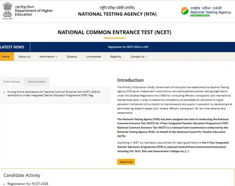 NCET Application Form 2026– अगर आप टीचर बनने का सपना देख रहे हैं और 4 साल के Integrated Teacher Education Programme (ITEP) में दाखिला लेना चाहते हैं, तो आपके लिए बहुत बड़ी खुशखबरी है। National Testing Agency (NTA) ने National Common Entrance Test (NCET) 2026 के लिए आधिकारिक नोटिफिकेशन जारी कर दिया है और 12 फरवरी 2026 से ऑनलाइन आवेदन प्रक्रिया शुरू हो चुकी है।