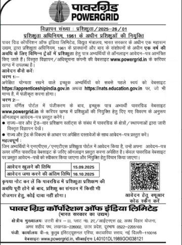 पावर ग्रिड कॉर्पोरेशन ऑफ इंडिया लिमिटेड (PGCIL) ने अप्रेंटिस भर्ती 2025 के अंतर्गत 1000+ पदों पर आवेदन आमंत्रित किए हैं। इन पदों पर चयनित अभ्यर्थियों को अलग-अलग ट्रेड और डिसिप्लिन के अनुसार नियुक्त किया जाएगा।