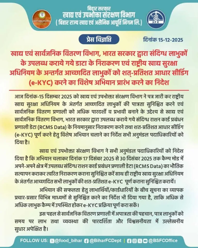 खाद्य एवं उपभोक्ता संरक्षण विभाग द्वारा सभी अनुमंडल पदाधिकारियों को निर्देश दिया गया है कि वे दिनांक 17 दिसंबर 2025 से 30 दिसंबर 2025 तक कैंप मोड में अपने-अपने क्षेत्र में उपलब्ध संदिग्ध राशन कार्ड प्रबंधन प्रणाली (RCMS Data) का भौतिक सत्यापन कराते हुए त्वरित निराकरण सुनिश्चित करें।