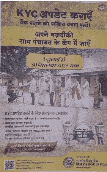 भारतीय रिज़र्व बैंक (RBI) द्वारा RBI KYC कैंप 2025 का आयोजन देशभर में बैंकों और ग्राम पंचायत स्तर पर किया जा रहा है। इस विशेष अभियान के अंतर्गत ग्राहकों को अपने बैंक खाते का KYC (Know Your Customer) अपडेट करने का अवसर मिलेगा।