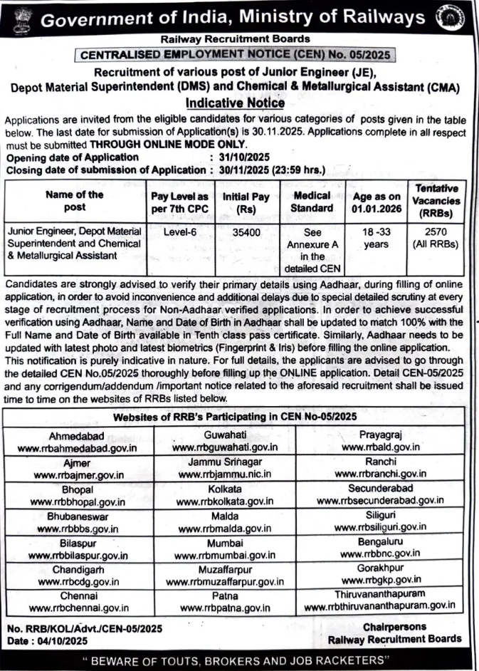 RRB JE Recruitment 2025: 2570 पदों पर निकली बंपर भर्ती जानें पूरी जानकारी
